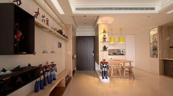 • 屋主比較期待通透開敞的公共空間,設計師借由天花和地面的分界,敞開串聯家的溫馨情景,卻不影響各自獨立的空間功能劃分。用無接縫的手作肌理和特殊刷色的空心磚堆砌,賦予客廳主墻細膩別致的質感脈絡。
